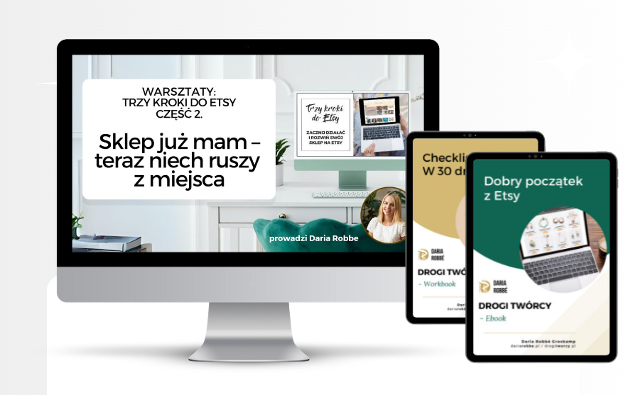 - 3 moduły kursu: Etsy Superstart, Etsy Supersklep, Etsy Supersprzedaż